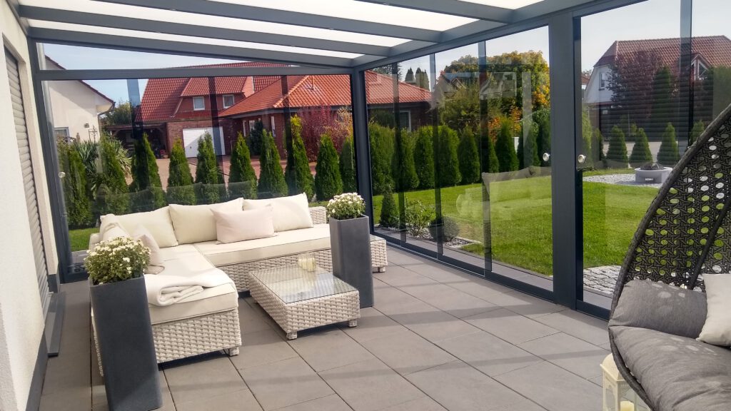 Kaltwintergarten in Anthrazit mit Glasschiebetüren und Seitenwand.